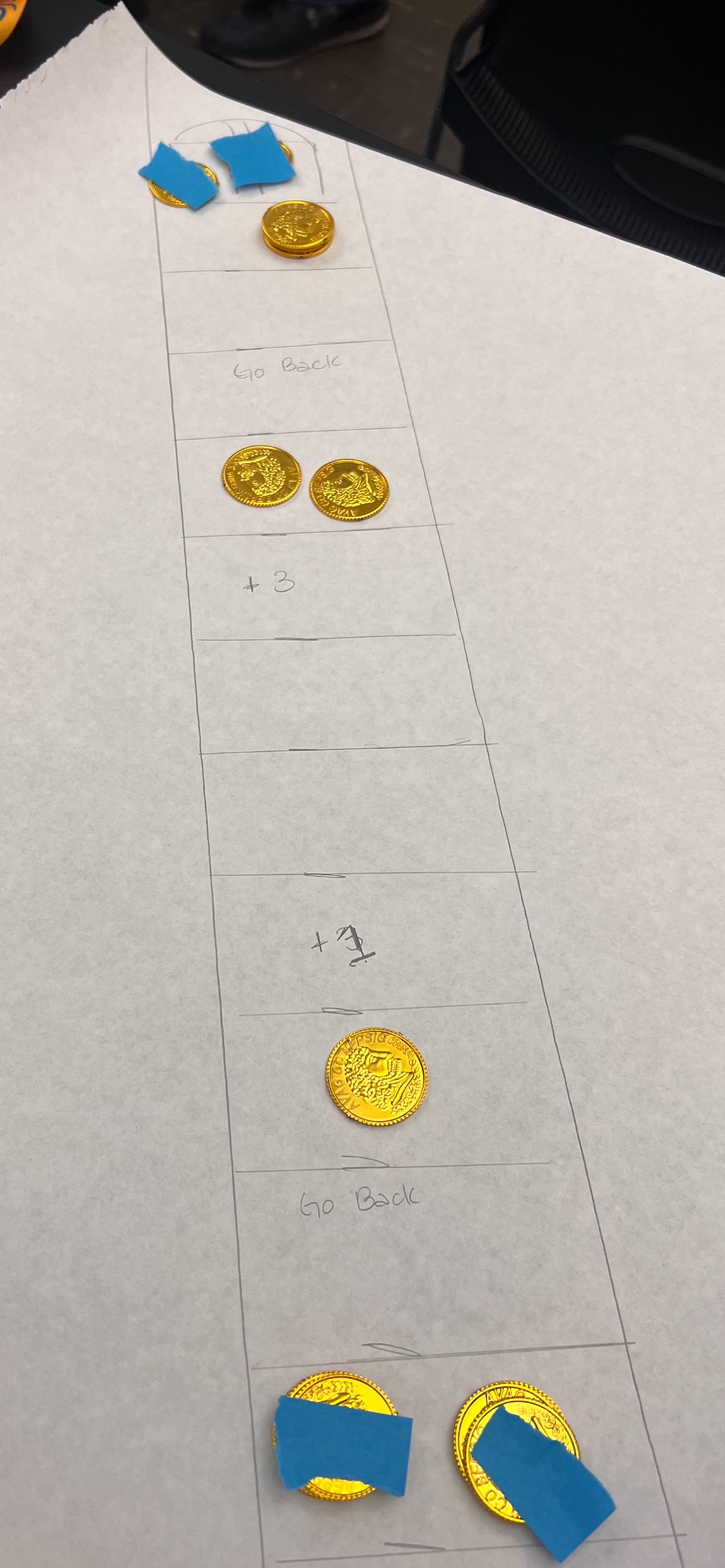 The first session was with a cousin of mine. I introduced the game, but there were a couple of hiccups. Since my departure with my partner, I added a couple of changes. starting with one if player #1 coins ends up into another players #2 chest that coin automatically turns into players #2 coin. This caused the game to be a never-ending game with no satisfaction. The second change was that instead of going back one space when landing, the go back space will send the players’ coins back to the treasure chest. Which at one point became annoying. With the feedback provided, I was able to make more changes for my second round.